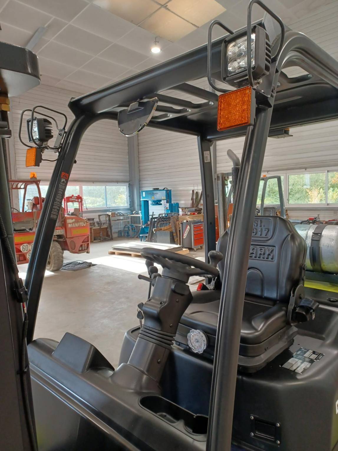 | Équipements | TDL (déplacement latéral), Positionneur de fourches, Cabine chauffée, Éclairage route, Feu à éclat, Blue spot, 4 voies hydrauliques |